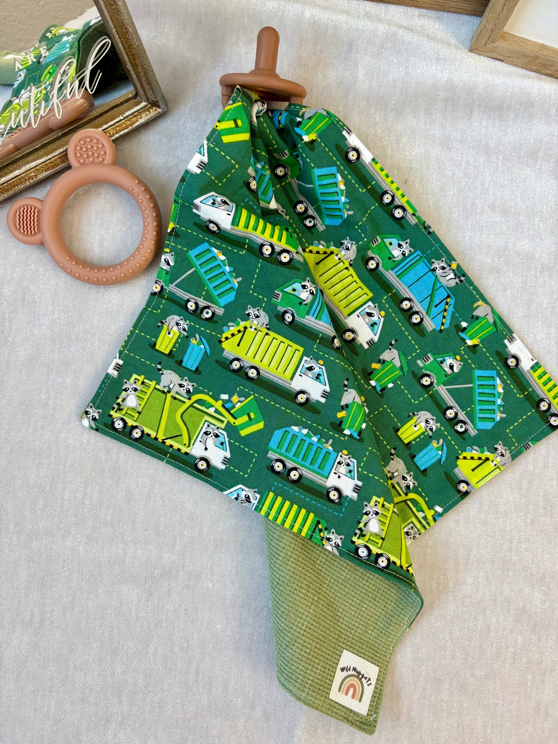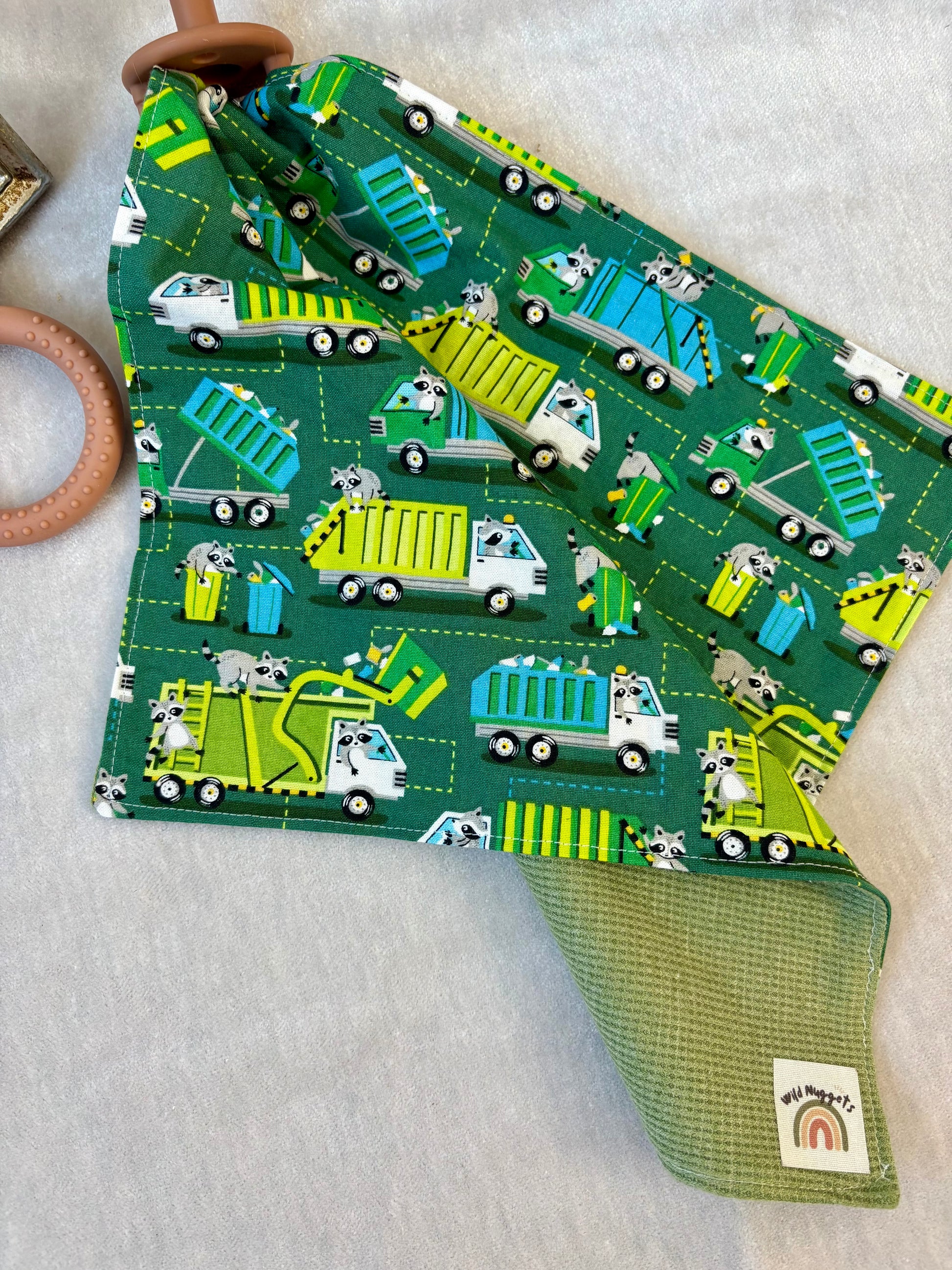 This adorable lovie is perfect for little truck lovers! Featuring a fun garbage truck and raccoon print on soft, cozy fabric, it’s designed to bring comfort and security to your little one at home or on the go.