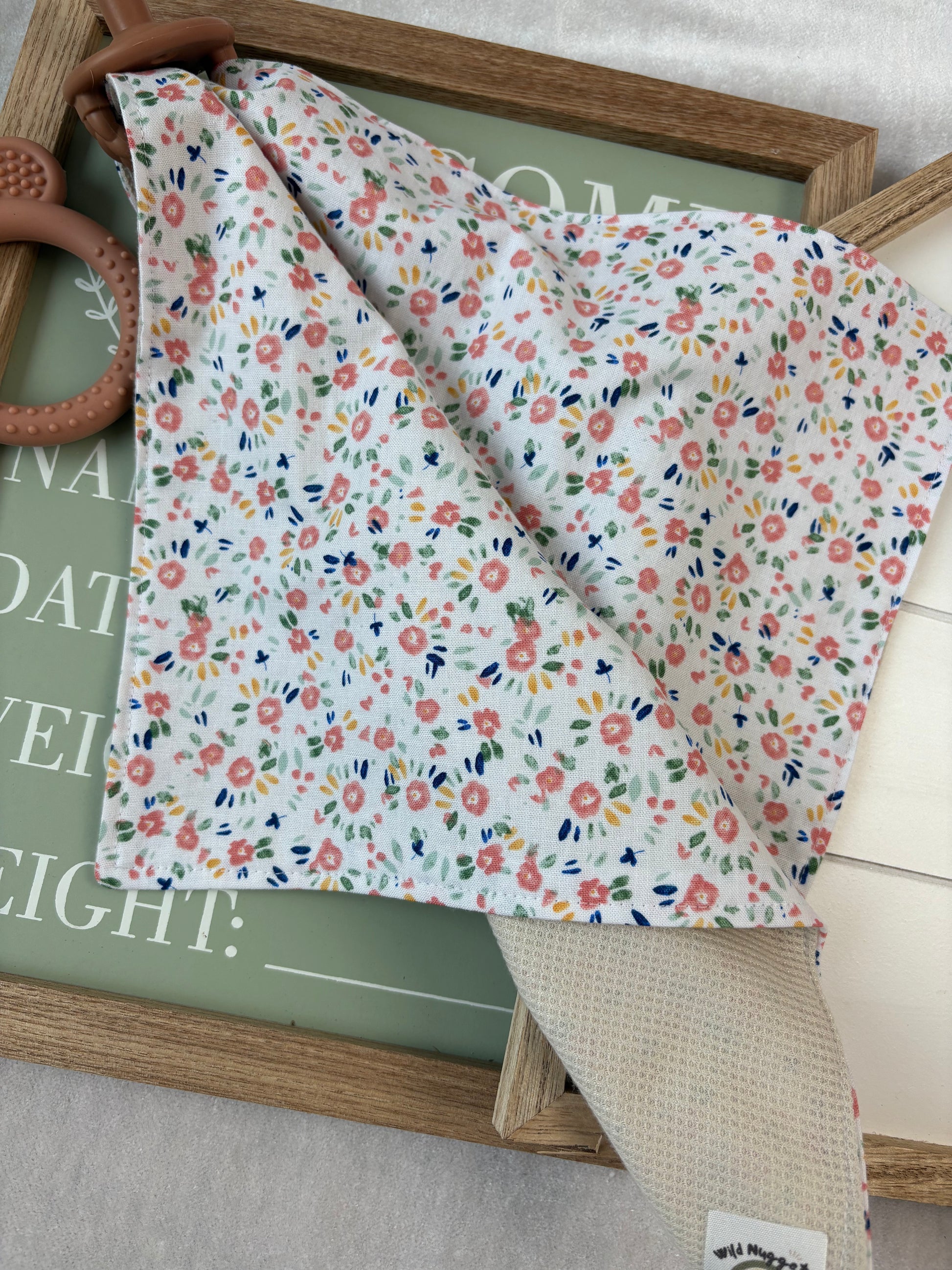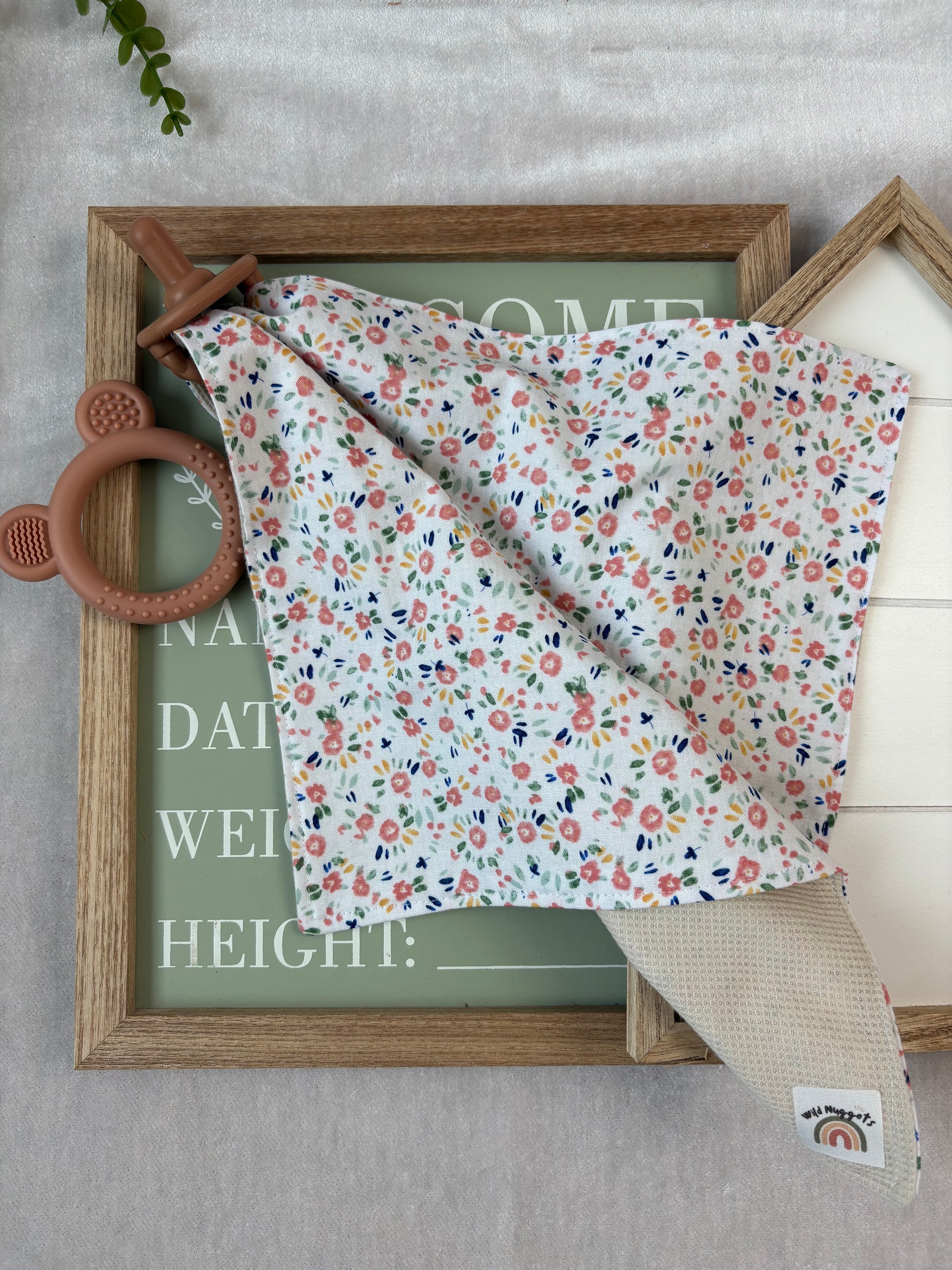 Settle into this chic watercolor Peonies Lovie. The warm tones will match your sweet nuggets southern charm. This Lovie is created with a cotton print front and backed with a cream jersey knit. A snap button to allow easy washing, drying and changing your favorite pacifier and teether.